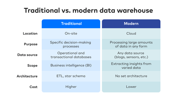Gde su tradicionalni data warehouse-i obično smešteni na mestu (on-site), moderni data warehouse-i koriste cloud infrastrukturu kako bi održali fleksibilnost. Međutim, kao što je ranije pomenuto, moderni data warehouse-i takođe mogu koristiti hibridnu arhitekturu gde je to prikladno.