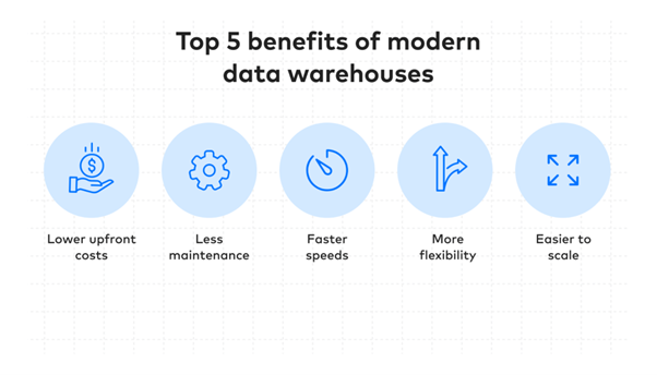 Moderni, bazirani na cloud-u data warehouse-i obično su mnogo brži od tradicionalnih data warehouse-ova smeštenih na lokaciji korisnika.